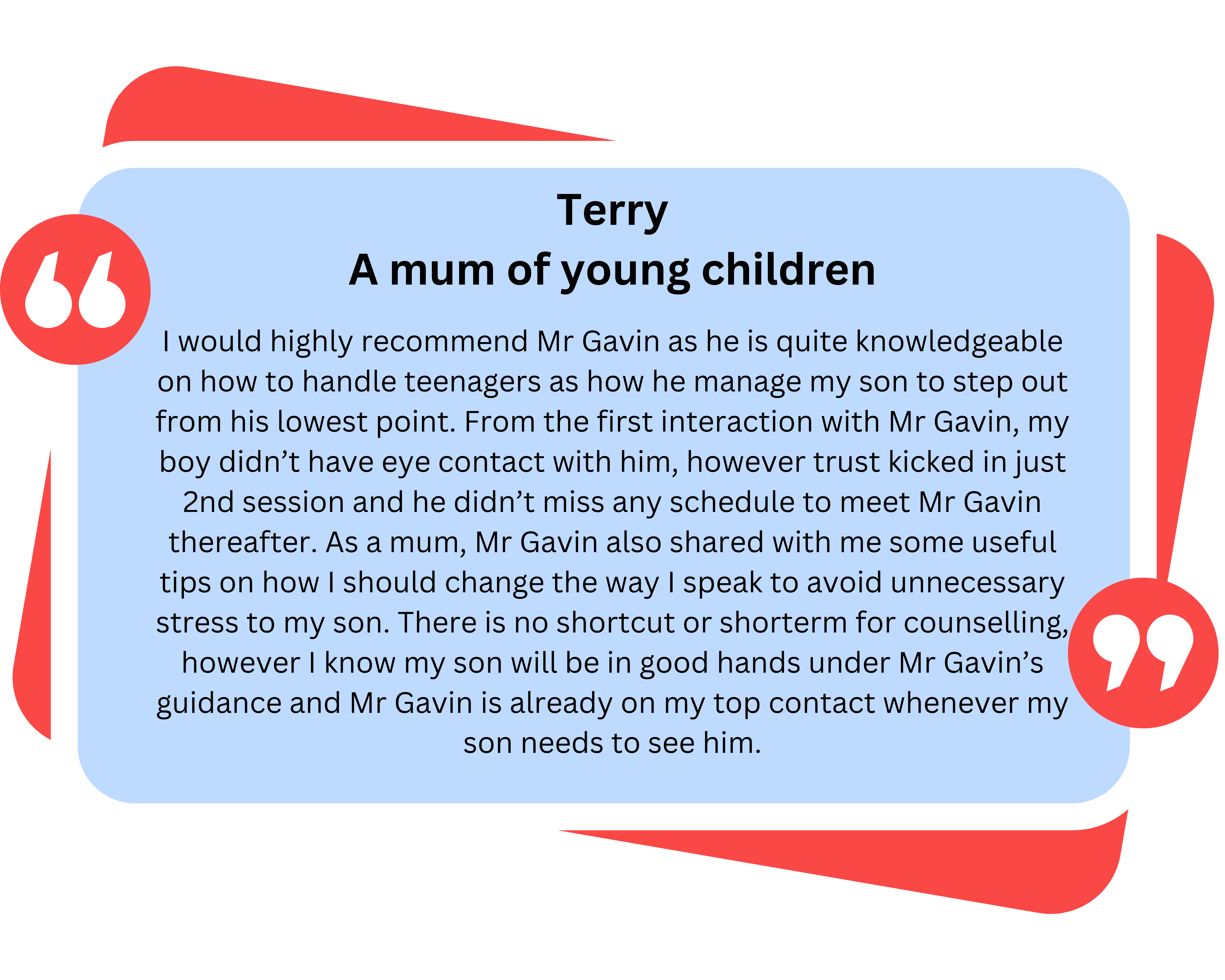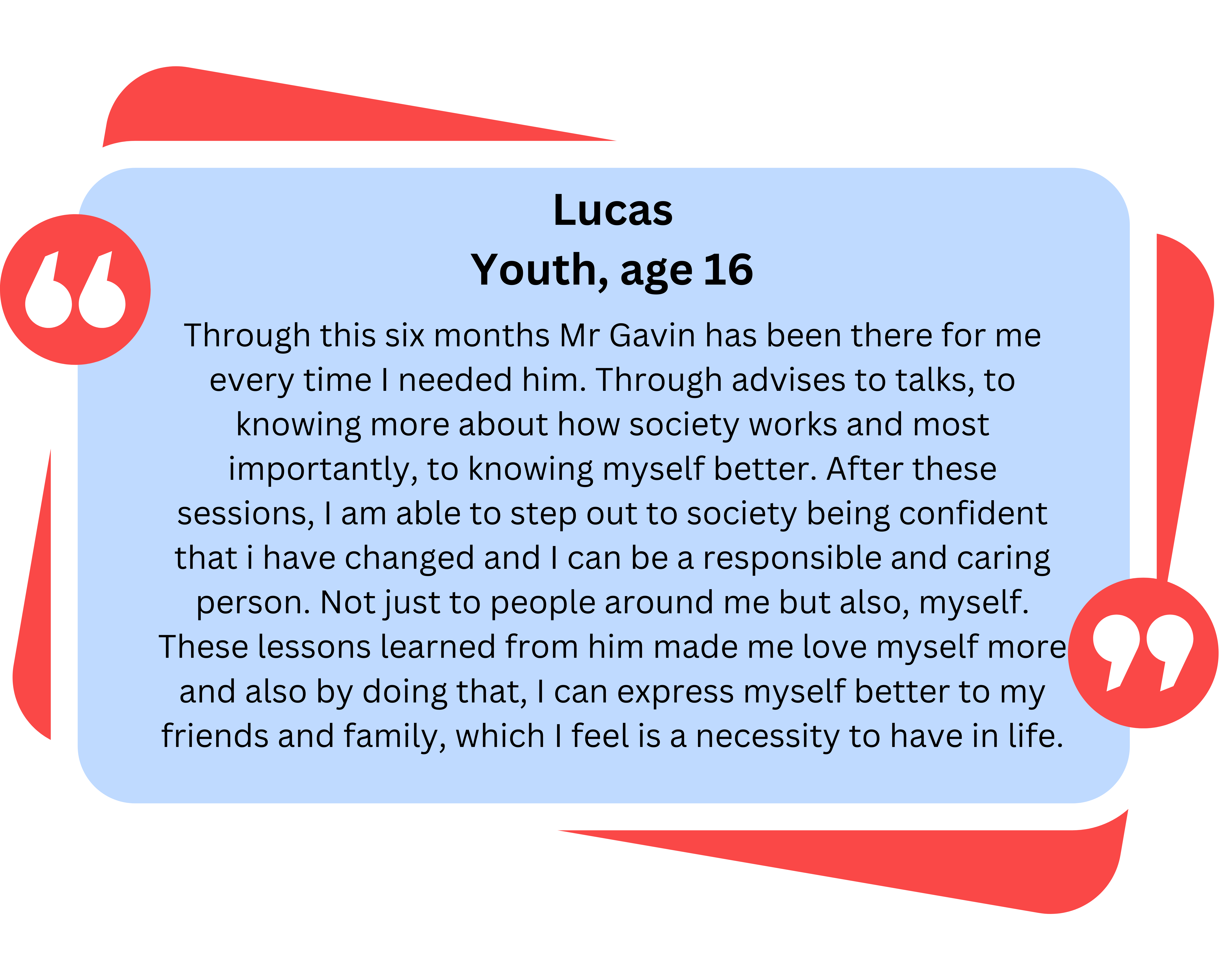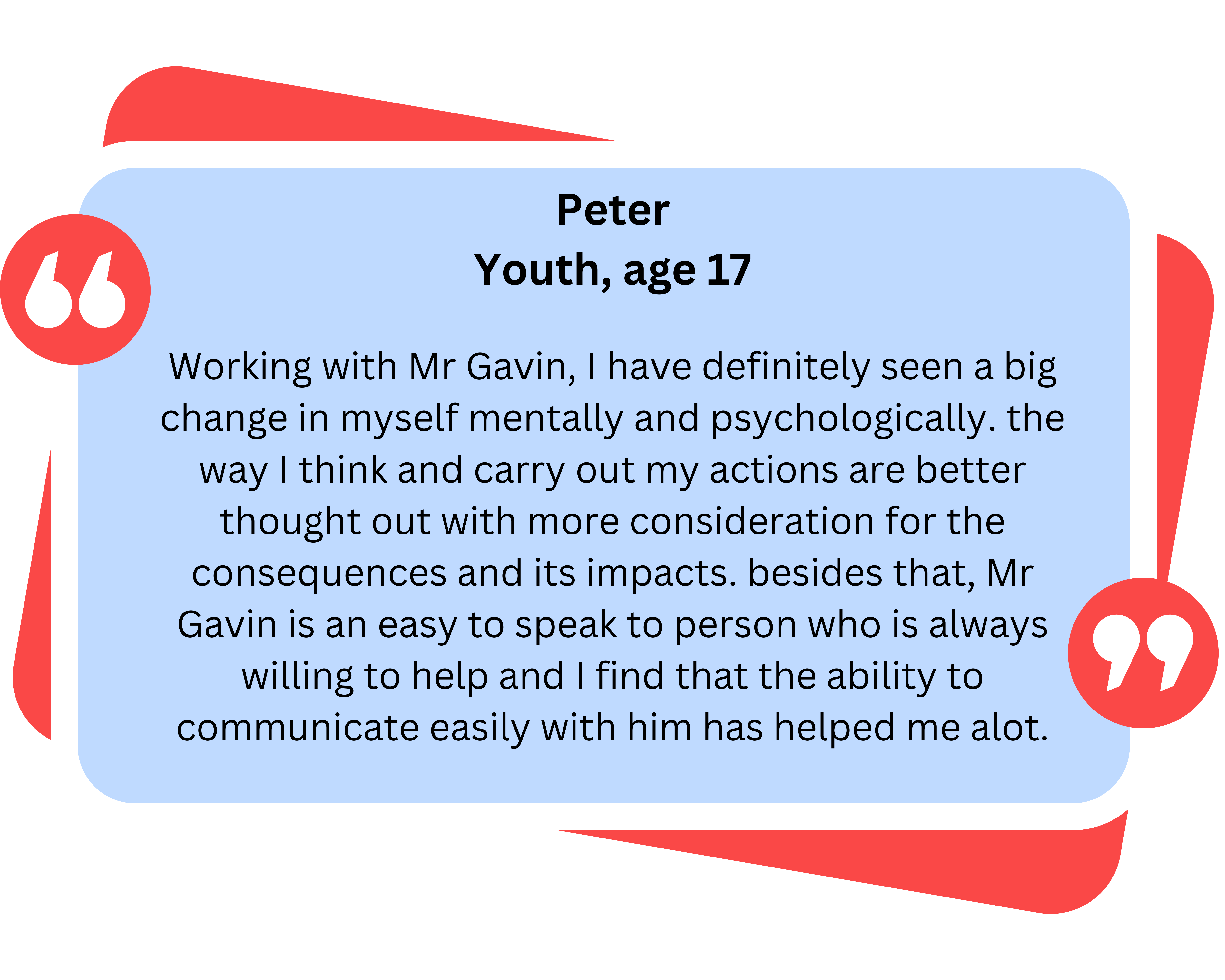 With a decade of experience, Gavin has successfully guided a wide range of young people. This includes students from MOE schools, those involved in the juvenile justice system, and even tertiary students. He extends his support to parents as well, providing guidance and resources to help them navigate their children’s development.